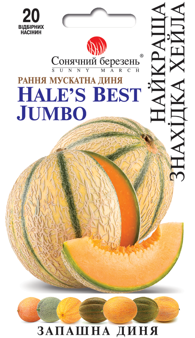 Створена в Каліфорнії в 1924-му році, ця диня досі ще широко популярна, бо поєднує чудовий смак з надзвичайною скоростиглістю і лежкістю. Вважається кращою з мускатних динь через високий вміст цукру, гладку текстуру і амброзійний аромат. Дині Hales Best Jumbo ростуть на сильних, енергійних лозах довжиною 1.5-2 метри. Овальні плоди дозрівають через 60-70 днів після сходів, досягаючи великих розмірів і ваги від 2 до 3 кг. Це з красивим овалом дині з темно-зеленою шкірою і щільною густою золотою сіткою на невеликих акуратних ребрах. М'якоть надзвичайно смачна - сильно запашна, дуже соковита, але з приємною твердою текстурою, що дає хрусткий «укус». І це в основному оранжево-червона, кольору лосося м'якоть, порожнина насіння мала і шкірка досить тонка. Цей сорт більше стійкий до посухи, ніж більшість інших, краще за все росте саме при жаркій погоді.