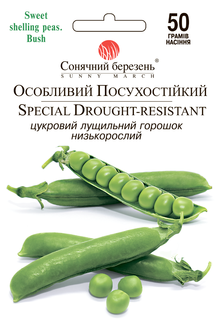 Лущильний сорт з зморшкуватим мозковим насінням, з якого виходить найсолодший горошок вищої якості. Перший сорт овочевого гороху з відмінною, унікальною для цієї вологолюбної культури (особливо у фазі цвітіння та наливу бобів) стійкістю до посухи. Середньоранній період від повних сходів до початка збору зеленого горошку 45-55 днів. Рослина короткостебельна, висотою 50-70 см. Листя та прилистки звичайного типу, зелені з плямистістю і дуже щільним восковим нальотом. Квітки білі, парні, великого розміру. Боби прямі, з тупою верхівкою, що генетично забезпечує їхню гарну та стабільну озерненість, до 8 горошин у бобі.