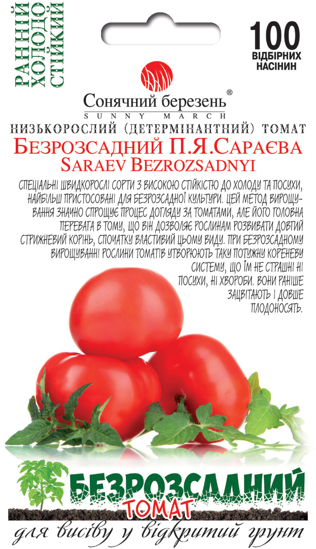 Сорт створений на основі морозостійких ґрунтових томатів селекціонера Павла Сараєва. Рослина детермінантна, слабогілляста, висотою 40-50 см. Ранній сорт, що дозріває через 100 днів після появи сходів. Помідори плоско-округлі, рівного червоного кольору, без плями у плодоніжки, щільні та м'ясисті, вагою 100-120 г. Смак солодкий, із вираженим томатним ароматом. Універсальний столовий сорт, використовується для консервації та засолювання.