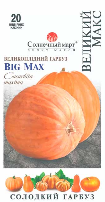 Якщо у Вас родючий ґрунт, багато вологи та простору, Big Max буде відповідати своїй назві. Величезні гарбузи можуть вирости до ваги понад 50 кг! Майже круглі, до 80 см в діаметрі, яскраво-оранжеві плоди з дуже товстою, 10-сантиметровою яскравою, жовто-оранжевою м'якоттю. Хороші для пирогів та зберігання. Плоди дійсно приємні, великі і важкі, що досягають 90 кг при вирощуванні для змагань та виставок, традиційних для США. Для більшого розміру залишайте тільки один або два гарбузи на лозу, прищипнувши кінчики стебел після утворення 3-5 плодів. Це сприятиме їх розвитку та дозріванню, яке настає через 110-120 днів після сходів, а також збільшить потенціал при зберіганні. Фахівці вирощують хороший великий гарбуз, який нелегко підняти. Якщо плоди на грядці встановлені вертикально, вони ростуть дуже красиво, мають красиву округлу форму, без деформації.